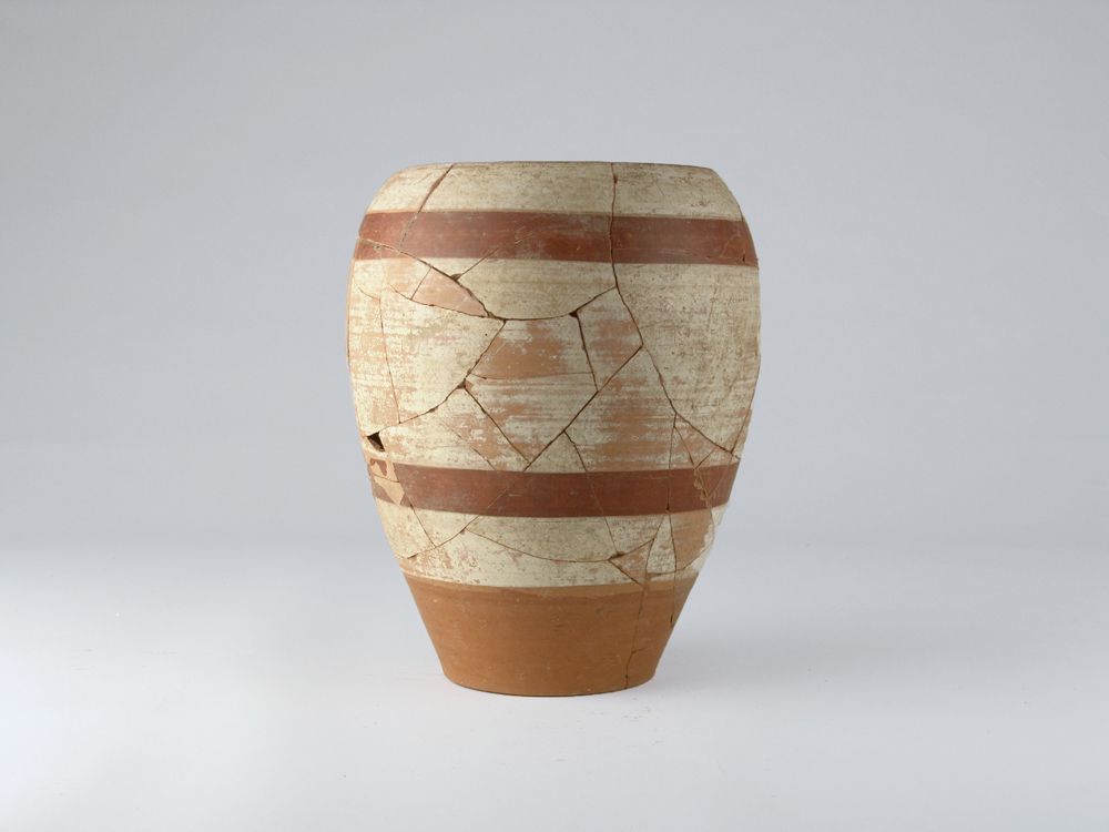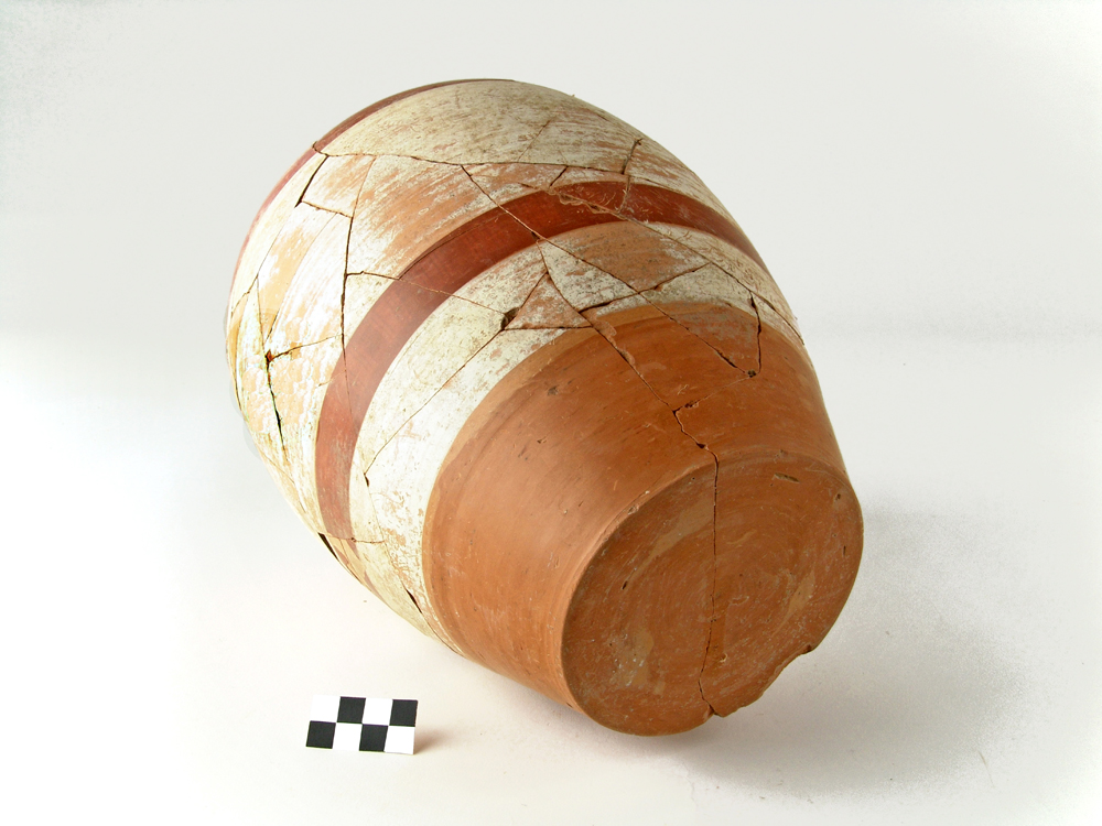 tenkostěnné nádoby točené na kruhu, zdobené bílým nátěrem a horizontálními pasy červené barvy (engoba).