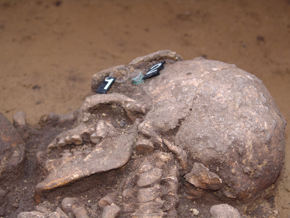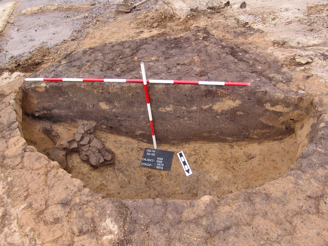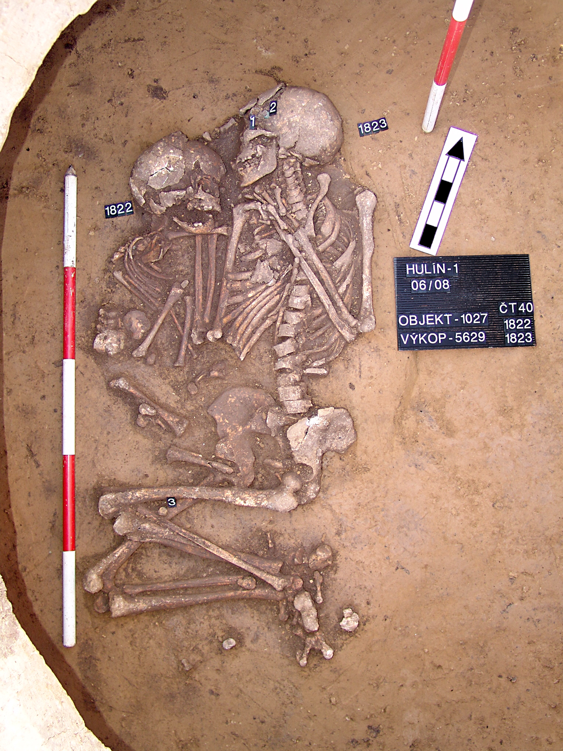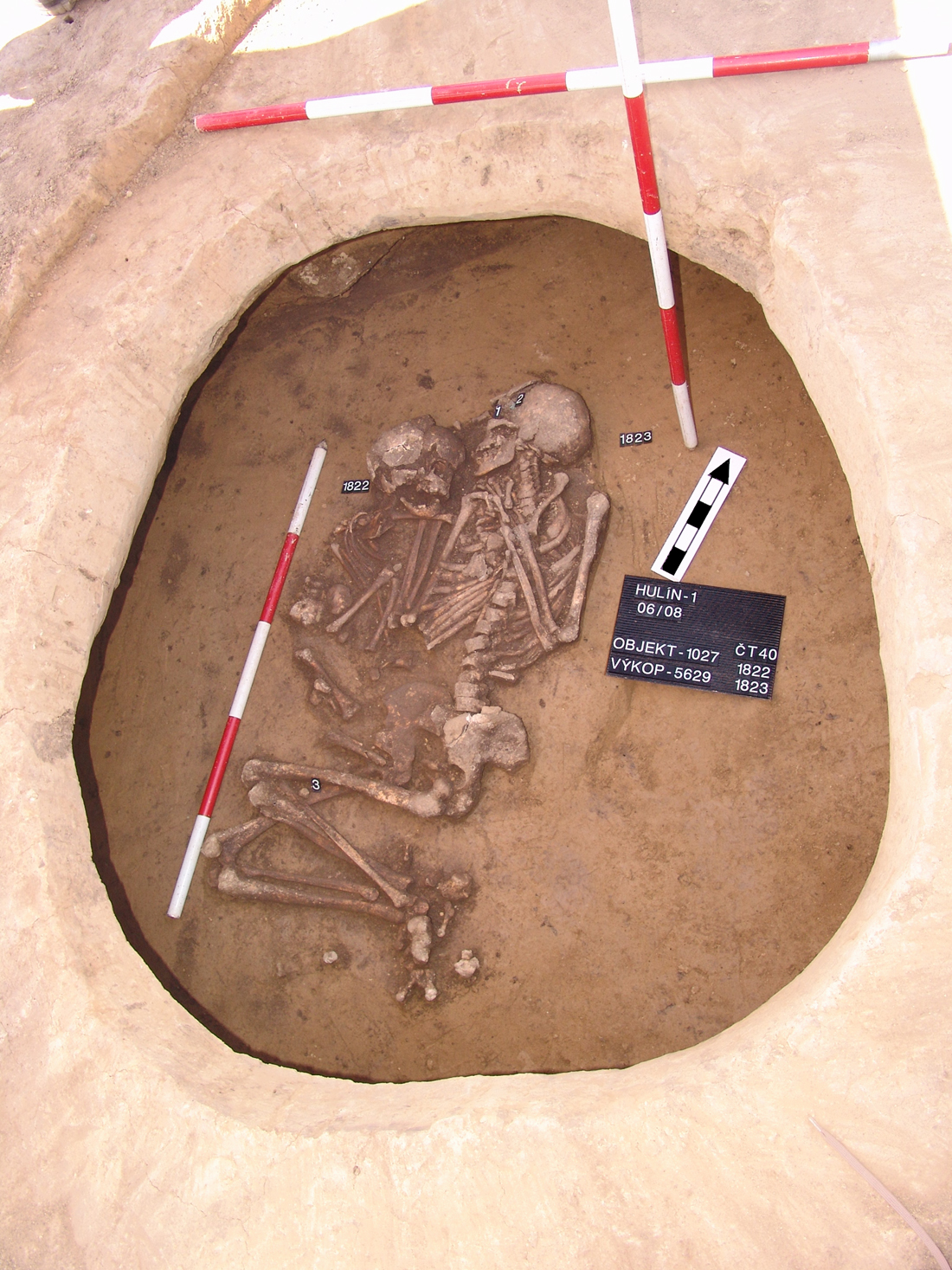 Mimo předměty denní potřeby, které obvykle vypovídají o životě pravěkých společností, se podařilo nahlédnout i do duchovního světa obyvatel Moravy před více než 3500 lety. Právě sem spadá nález dvou jedinců odkrytých v zásobní jámě ze starší doby bronzové. Na jeho dně byli uloženi žena a dítě ve skrčených polohách. Dítě na levém a žena na pravém boku. Oba mrtví leželi tvářemi k sobě a dětská hlava spočívala v ženině pravé dlani (obr. 4, 5). Na její lebce spočívaly tři bronzové záušnice (obr. 6). Co bylo důvodem k pohřbu do zásobní jámy, která na pravěkých osadách plnila funkci jakýchsi sklípků? Nelze říci určitě, protože ve starší době bronzové se jev ukládání mrtvých uvnitř sídlišt objevuje velmi často, vždyť jen z katastrů Hulína, Chrášťan a Pravčic je těchto jedinců známo na 50! Rekonstrukci těchto pohřbů navíc stěžuje jeho neustálený ritus – setkáme se s ojedinělými i hromadnými pohřby, jedinci jen pohozenými i pietně pohřbenými s relativně bohatými milodary. V našem případě se přikláníme ke standardnímu pohřbu dvou osob, kdy byla místo hrobové jámy použita zásobní. Lákavou hypotézu, že šlo o matku s dítětem může potvrdit jen analýza DNA.