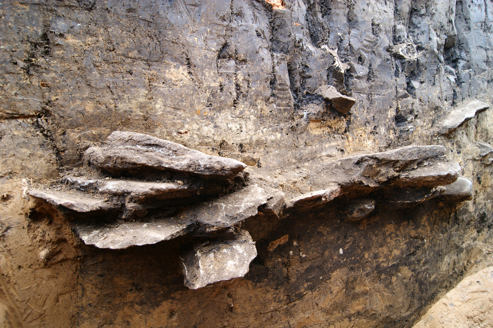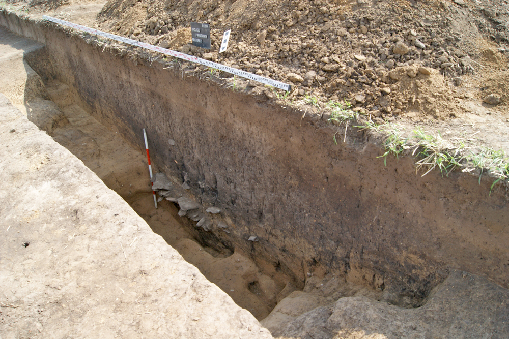 Pro výzkum byla vytyčena sonda o rozměrech 30 x 1 m, která si kladla za cíl protnout příkop a obě palisády. Příkop byl zachycen v šířce 6,3 m a dosahoval hloubky 1,95 m. V hloubce 1,3 - 1,5 m byla zachycena souvislá vrstva především lomového kamene proloženého kompaktní spraší a hroudami jílu (spadená zeď, plenta?). Pod touto úrovní vanovitý řez příkopu schodovitě padal o 0,5 m.