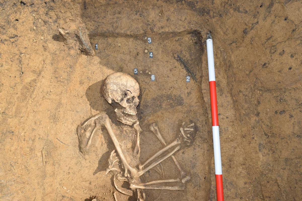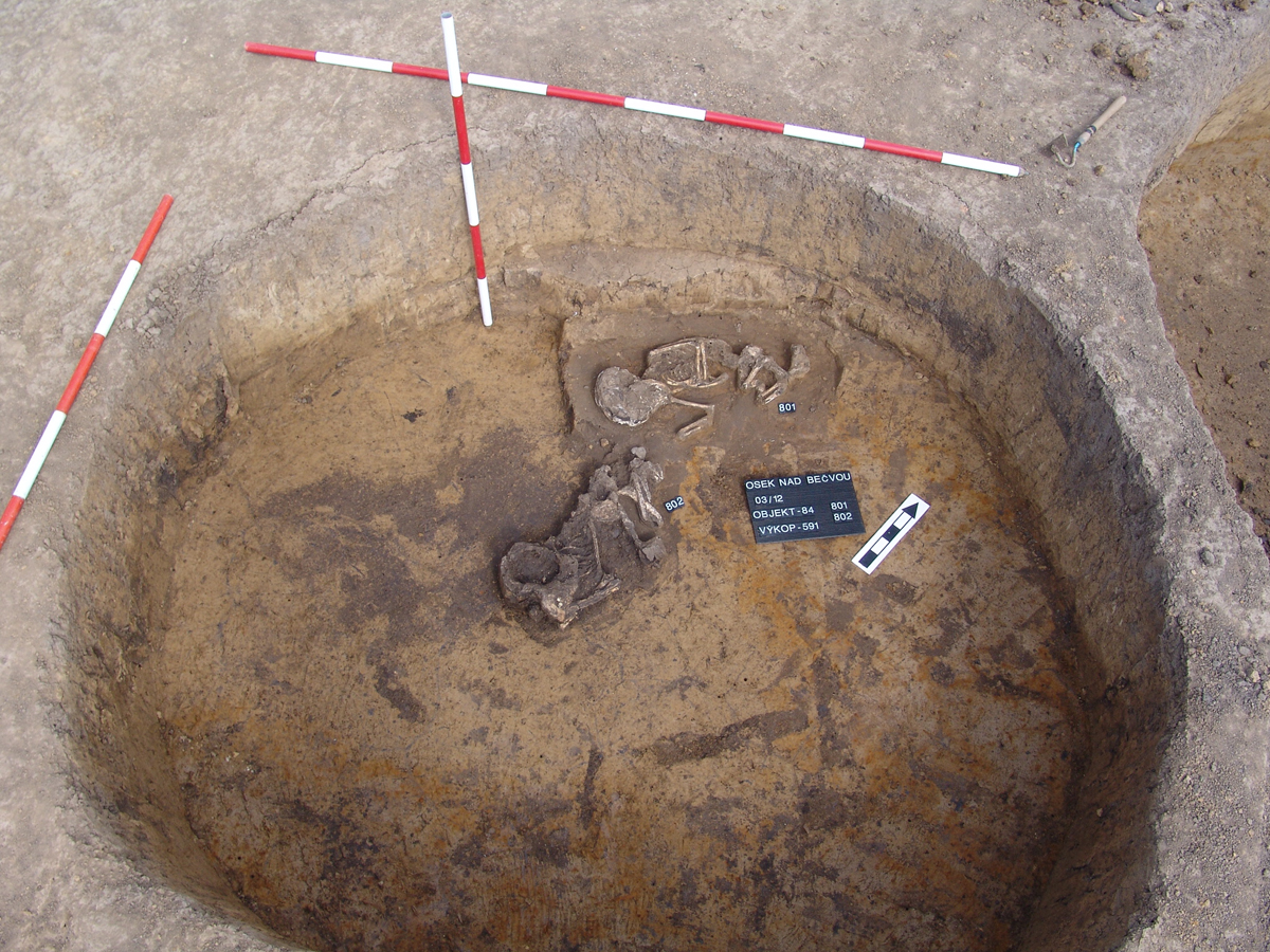 Na zkoumaném sídlišti byly objeveny též ve třech jamách lidské kostry, převážně dospělých osob, a v jednom z objektů kostry dvou dětí. Všichni mrtví byli uložení do objektů ve skrčené poloze na pravém či levým boku - v podstatě bez hrobové výbavy, jakou známe z pravidelných hrobů. Jedná se s největší pravděpodobností o stopy pravěkých rituálů, pravděpodobně o lidské oběti uložené do země v době špatné úrody, hladomoru či živelných pohrom s cílem získaní si přízně božstev.