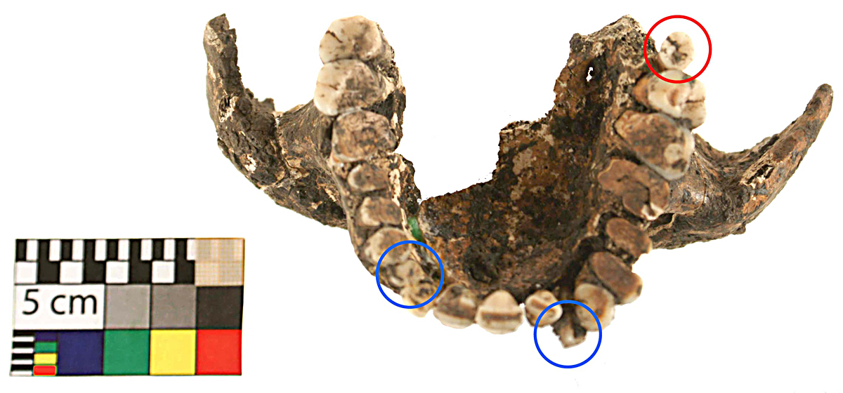 Antropologickou laboratorní analýzou byla zjištěna zřejmě oboustranná fraktura krčků dolní čelisti, s jistotou byl zlomen krček levý. Fraktura byla zhojena, došlo však k apozičnímu srůstu levé hlavice s krčkem. Zlomenina vznikla jako následek silného úderu či pádu na bradu. Důsledkem nenastala jen zlomenina krčků, ale i ante-mortem ztráta všech čtyř spodních řezáků (viditelná je resorpce zubních lůžek). Zhojení tak vážného traumatu je důkazem léčebných dovedností i altruistického chování tehdejší společnosti. Zlomenina musela být nejen fixována, ale k následné rehabilitaci muselo dojít poměrně brzy (maximálně po šestitýdenní fixaci), nedodrží-li se tento časový interval, dochází ke srůstu temporomandibulárního kloubu za vzniku ankylózy.